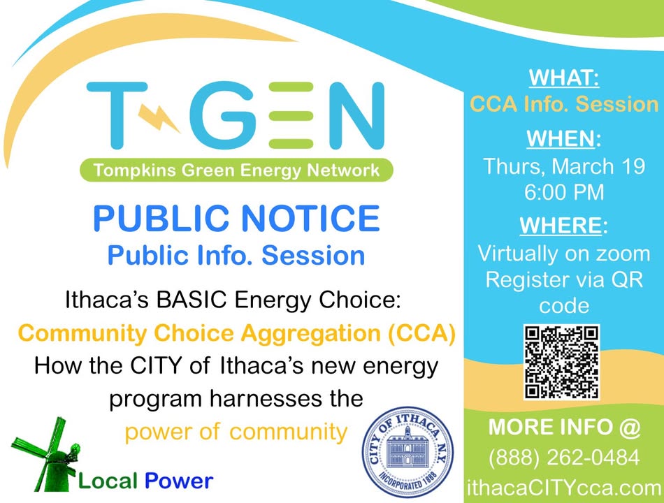 More information and registration are available at http://ithacacitycca.com/ and http://ithacacitycca.com/T-GEN. Tompkins Green Energy Network is listed as a source.
